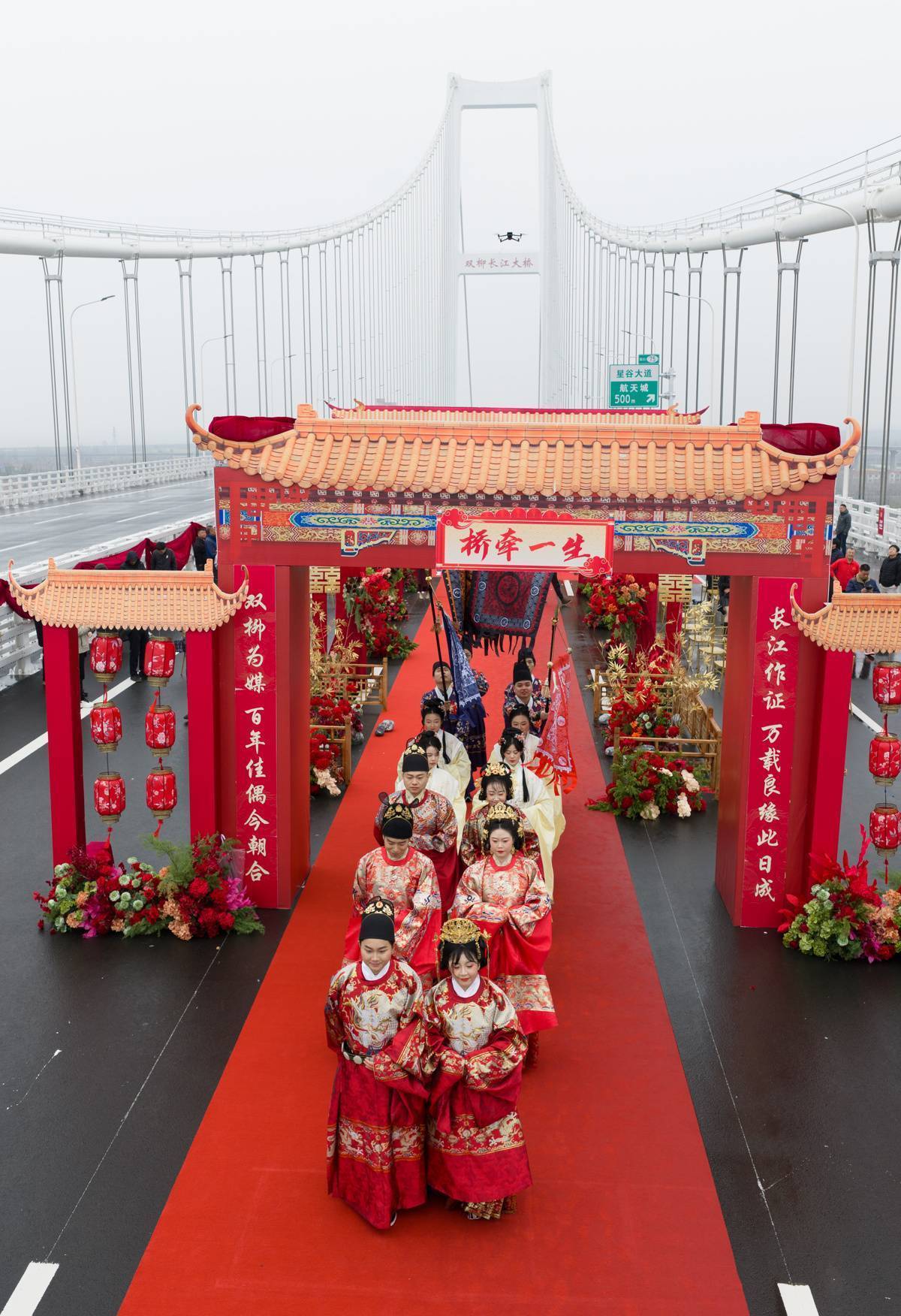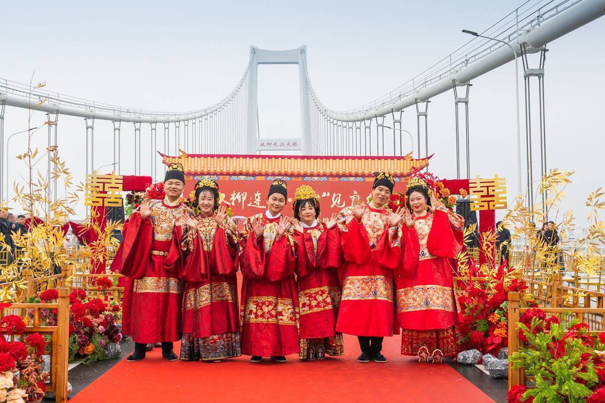 细雨缠绵,江风拂面。没有往日的机器轰鸣,取而代之的是悠扬雅乐。3月18日,双柳长江大桥暂时卸下“硬核”工程的外衣,化身一座“婚礼殿堂”。三对新人在大桥上喜结连理,他们是彼此的爱人,也是这座世界级大桥的建设者,甚至为了大桥建设,把婚期一推再推。